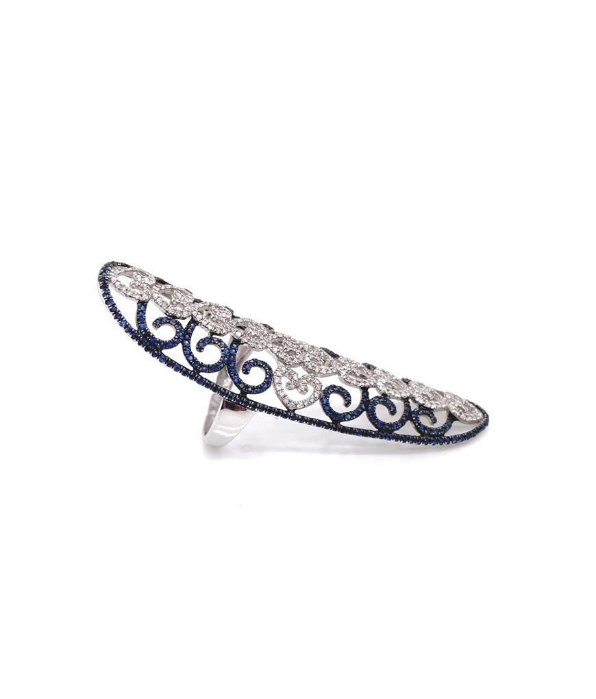 Anel de brilhantes e safiras azuis, em Ouro 18k, com 6,2cm de extensão. Ouro Branco.