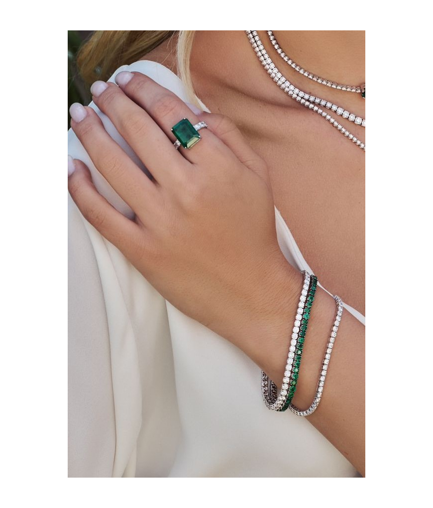 Anel em Ouro Branco (18k) com Esmeralda central formato retangular (5.80 ct) e Brilhantes sobre o aro (0.73 ct).